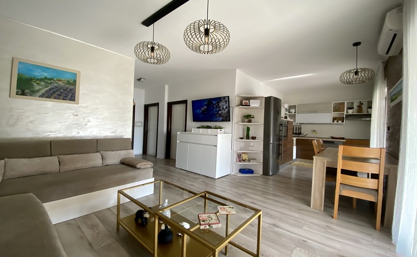 In the living room are sofas which can also be used as sleeping beds for two persons. There is air conditioning unit. Led TV (standard channels and added 16 sports channels, 11 for children, 18 music, 24 film channels…….). WI-FI is free.
