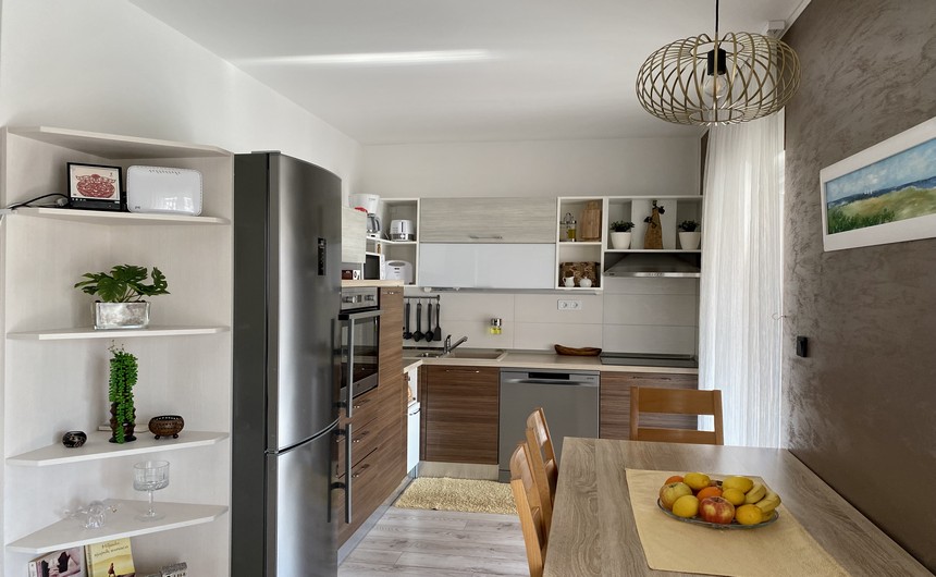 The kitchen is fully equipped with refrigerator with freezer, cooker with oven, microwave, kettle, filter coffee machine, Nescafe dolce-Gusto coffee machine with capsules, dishwasher.