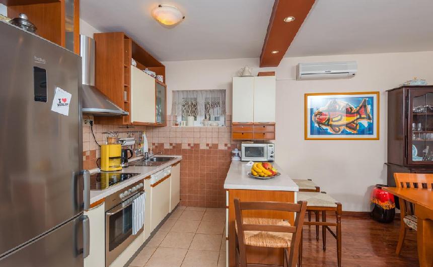 It consists of 2 bedrooms with comfortable double beds. Also, a large living room with sofa that can be turned into bed for two. Apart from said, there is a very nice kitchen with dining room, and also a bathroom. Kitchen has all amenities including the dishwasher. Therefore, there is everything that you might need for relaxed holidays in Dalmatia.